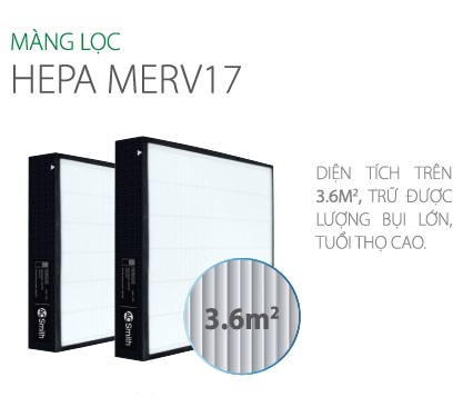 Máy sở hữu màng lọc HEPA tiêu chuẩn MERV17 có khả năng loại bỏ bụi mịn và siêu mịn có kích thước siêu nhỏ đến 0,3 micron. Bộ lọc HEPA này có kích thước lớn đến 3.6m2 gấp thành 100 nếp gấp, giúp máy lọc sạch các phân tử bụi siêu mịn PM2.5 với hiệu suất cao nhất.
