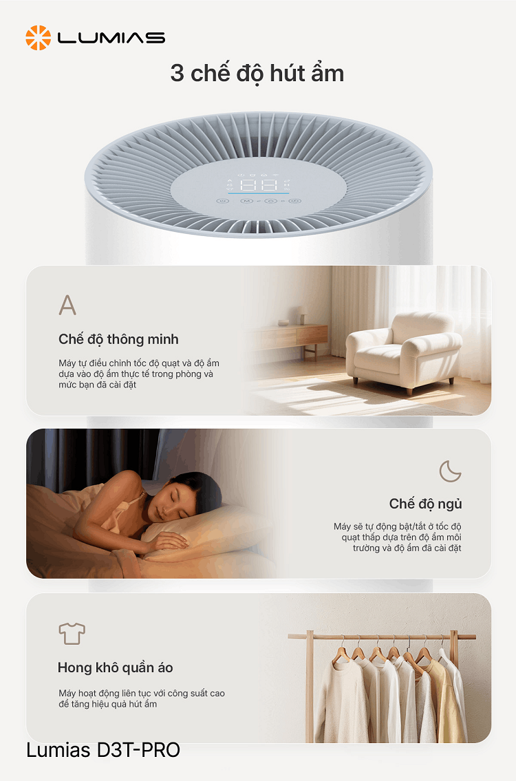 Máy hút ẩm Lumias D3T-PRO có 3 chế độ hoạt động linh hoạt, đáp ứng tốt nhu cầu sử dụng hằng ngày.