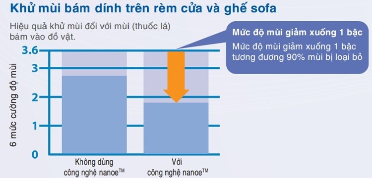 Nhờ có công nghệ Nanoe, máy lọc khí Panasonic có khả năng làm giảm 90% mùi (mùi thuốc lá) chỉ sau 30 phút.