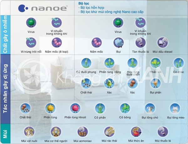 NanoE là công nghệ kết hợp giữa công nghệ Nano và Electric, tạo ra các hạt bao xung quanh là các phân tử nước và vô vàn gốc OH-, giúp loại bỏ mọi vi khuẩn, virus, mùi hôi và chất gây dị ứng tồn tại trong môi trường không khí.
