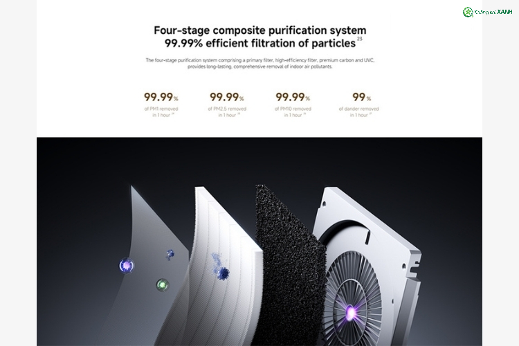 - Loại bỏ 99,999% PM1, PM2.5, PM10 trong 1 giờ